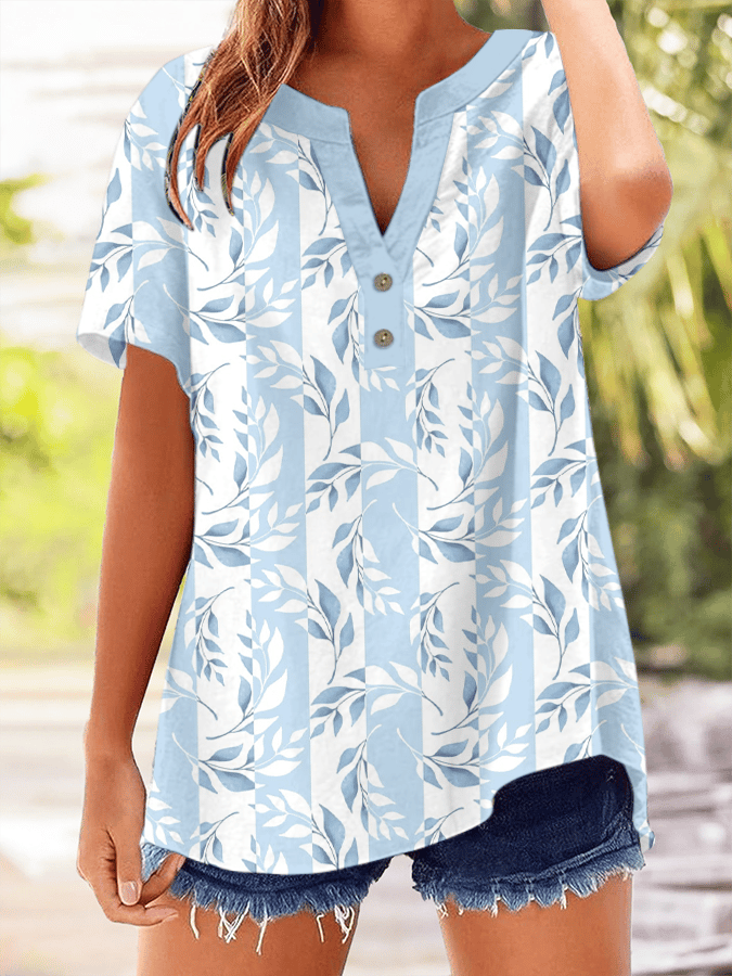 Women's Vintage Botanical Floral Button Design V-Neck Short Sleeve Shirt