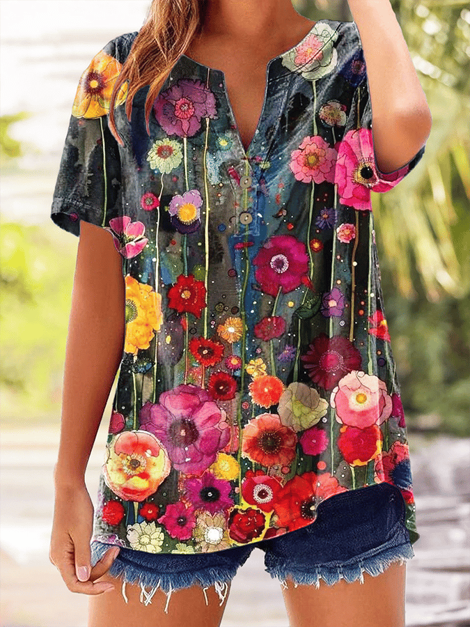 Women's Vintage Oil Painting Floral Button Design V-Neck Short Sleeve Shirt