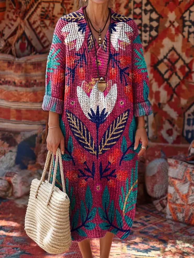 Women's Vintage Red Flower Art Print Casual V-neck Knit Dresses