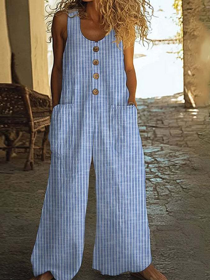 Women's Vintage Striped Design Button Casual Jumpsuit