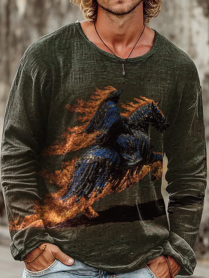 Men's Vintage Ghost Rider Art Print Casual Cotton Crew Neck Pullover Shirt