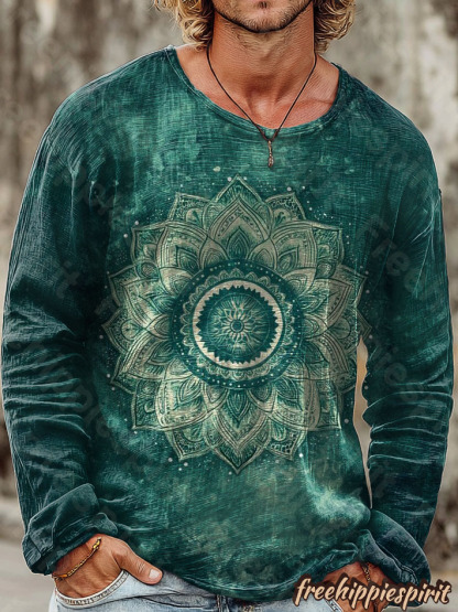 Men's Vintage Green Mandala Art Print Casual Cotton Crew Neck Top