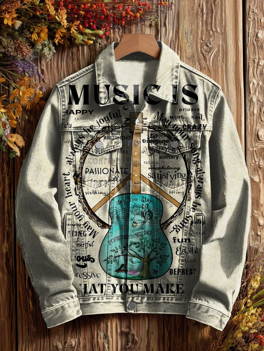 Unisex Vintage Beige Peace Guitar Hippie Art Print Casual Denim Jacket