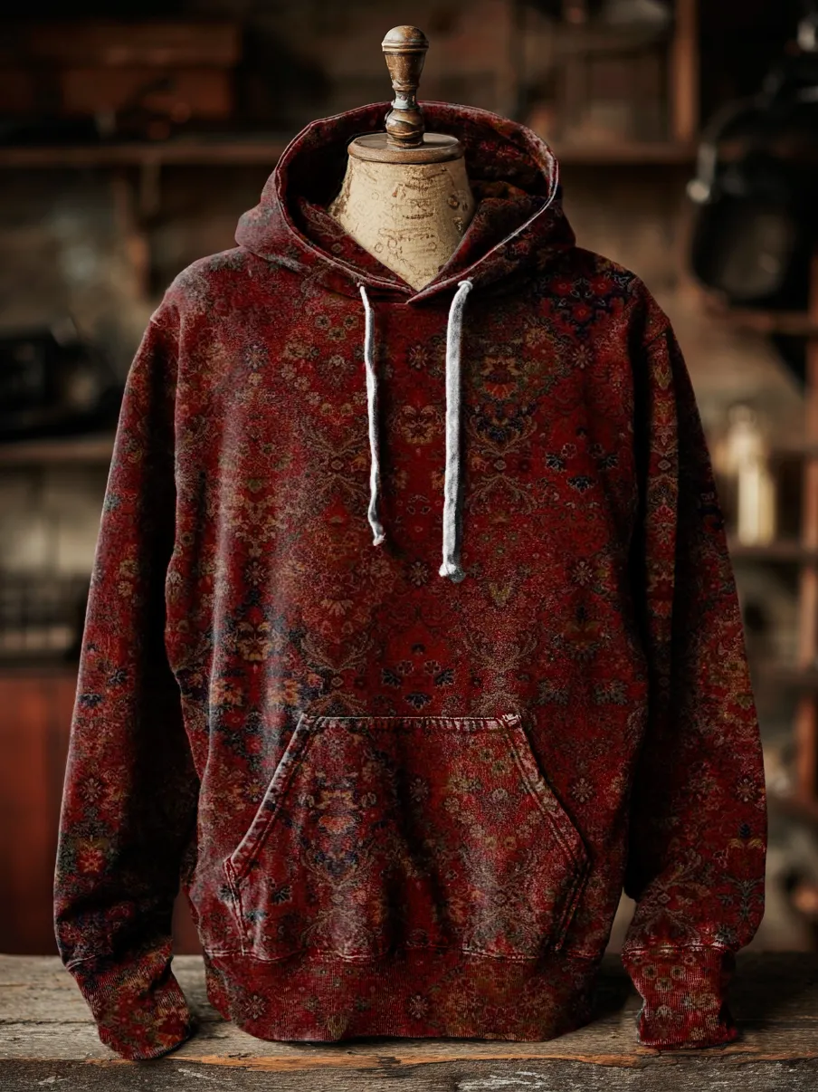 Unisex Vintage Ethnic Red Floral Art Print Casual Hooded Pocket Sweatshirt