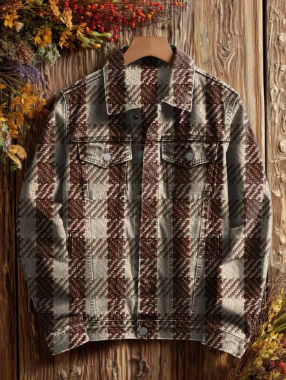 Unisex Vintage Red-and-White Plaid Art Print Casual Denim Jacket