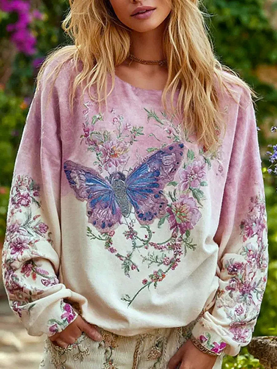Women's Floral Butterfly Art Print Casual Cotton Sweatshirt