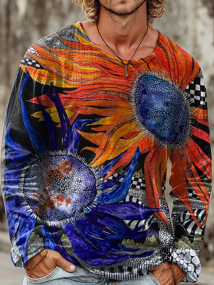 Mens Vintage Abstract Sunflower Art Printed Casual Round Neck Pullover Cotton Shirt