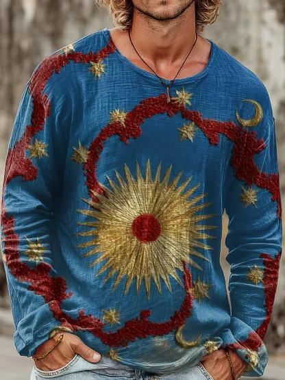 Mens Vintage Blue Sun Art Print Casual Round Neck Pullover Cotton Shirt