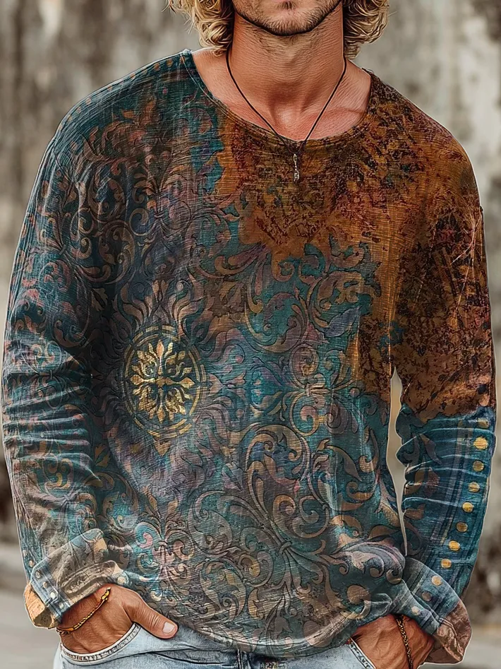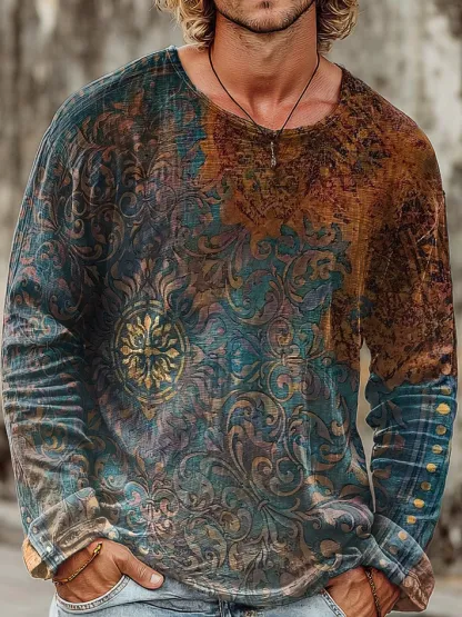 Men's Vintage Ethnic Floral Totem Art Print Casual Crew Neck Pullover Cotton Shirt