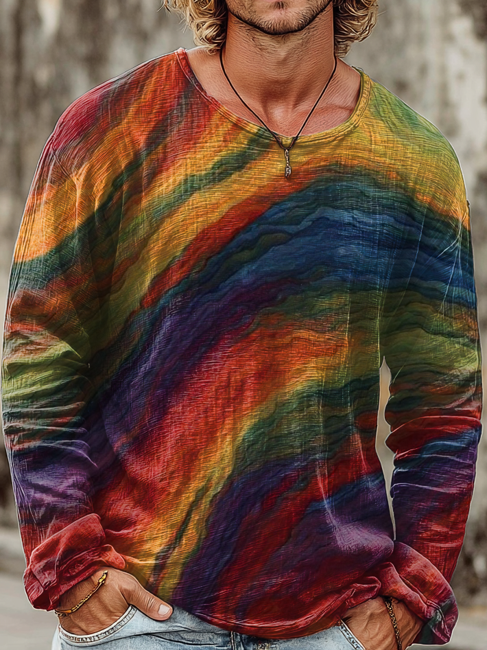 Men's Vintage Rainbow Abstract Pattern Art Printed Casual Round Neck Pullover Cotton Shirt