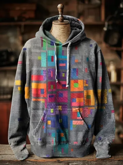 Unisex Retro Colorful Geometric Art Print Hooded Pocket Sweatshirt