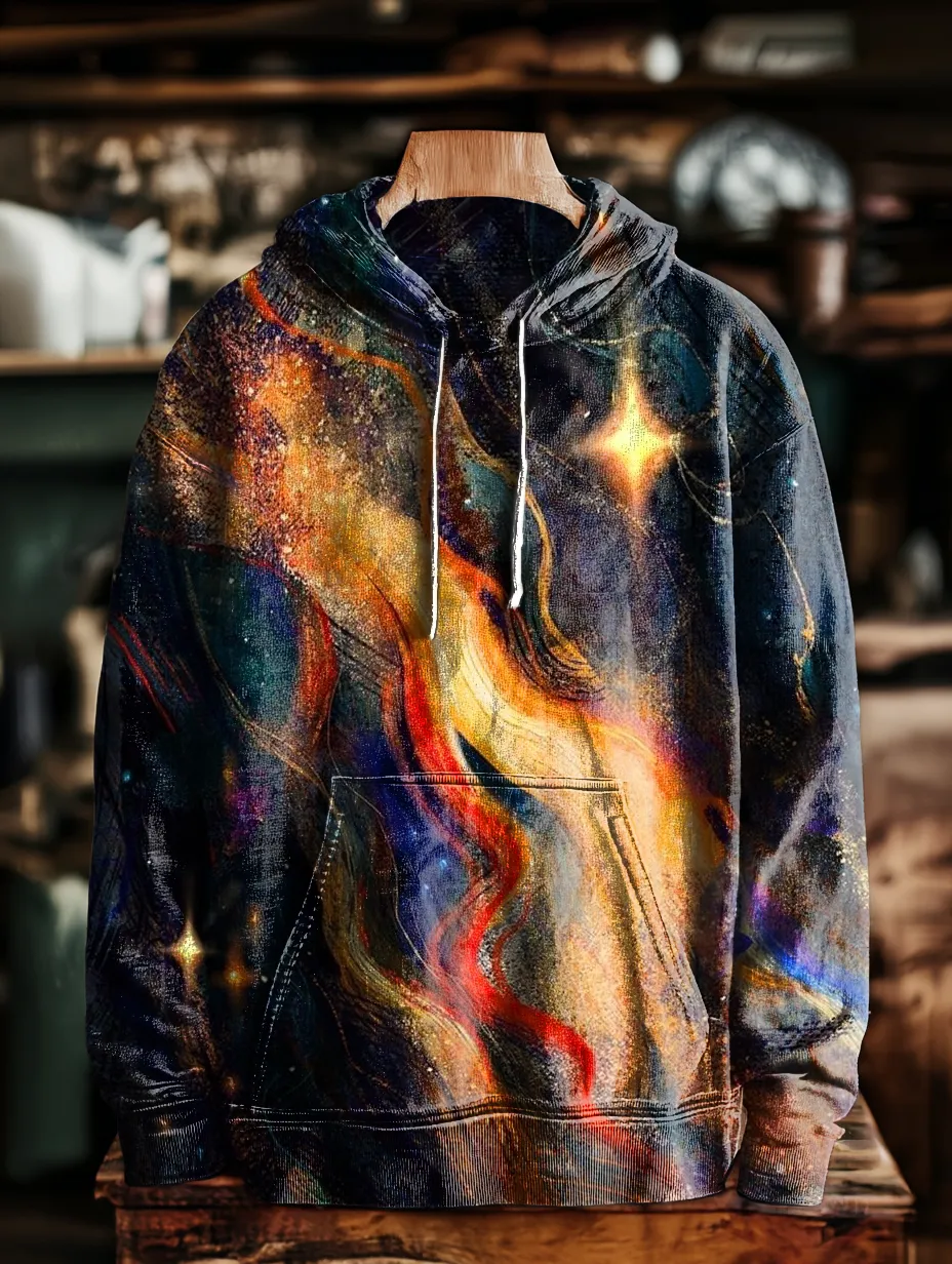 Unisex Romantic Star Cosmic Abstract Art Print Leisure Pocket Hooded Drawstring Sweatshirt