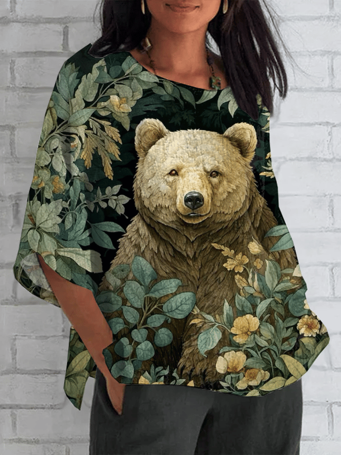 Women's Forest Bear Print Round Neck Casual Cotton and Linen Shirt