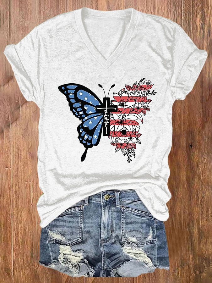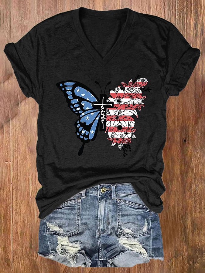 Women's Faith Flag Print V-Neck Casual T-Shirt