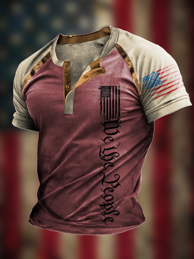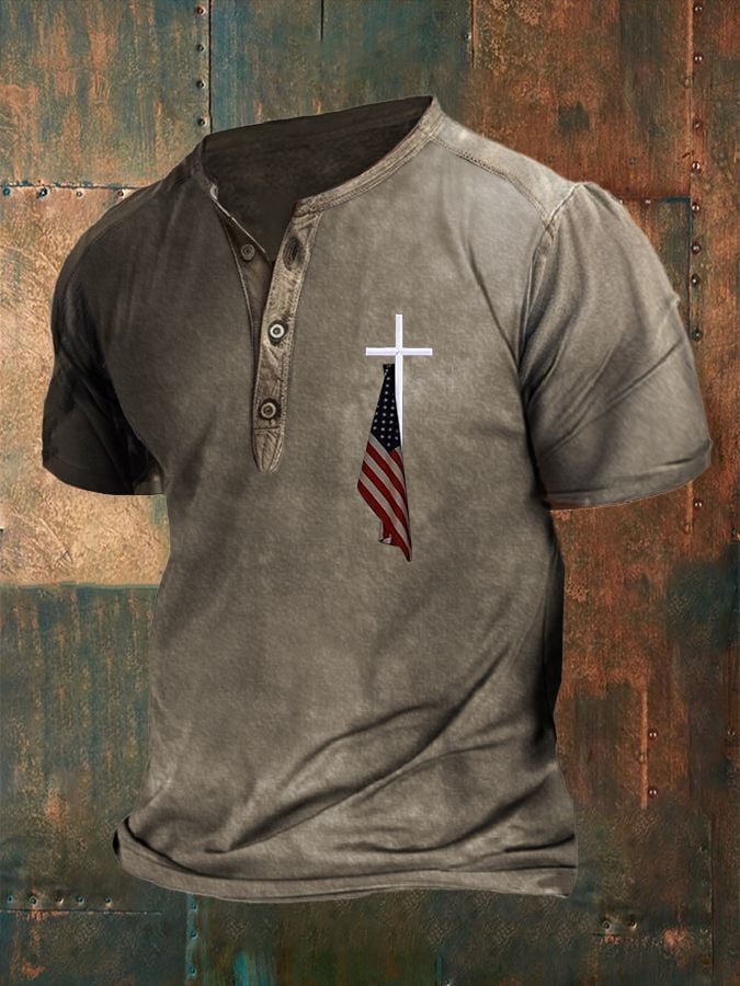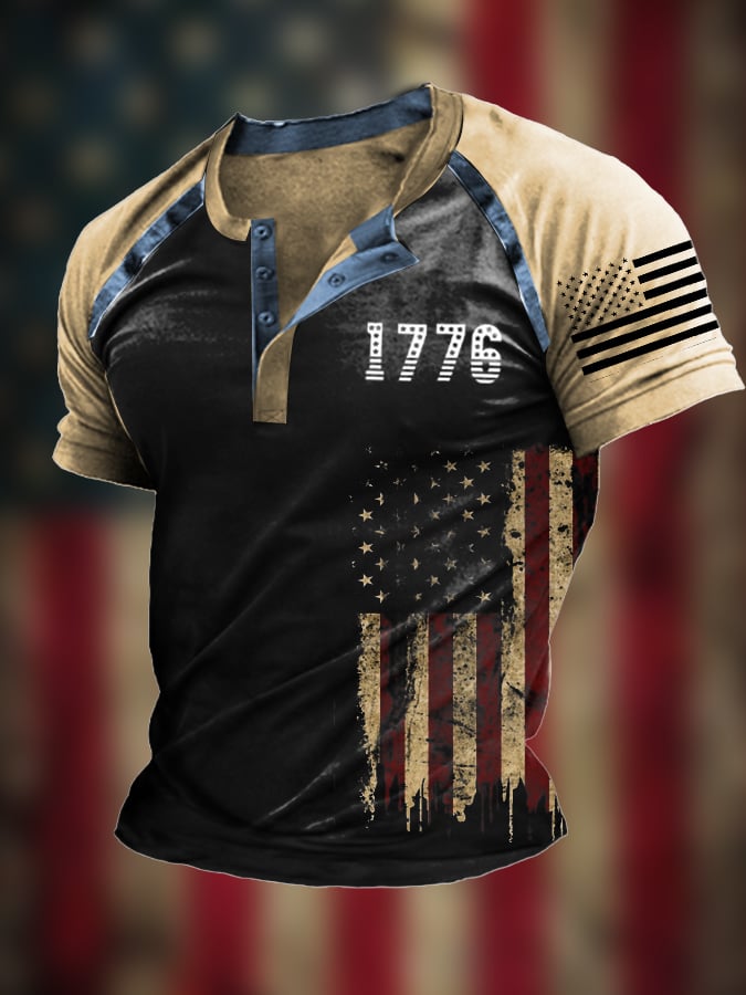 Men's Vintage Patchwork Flag Independence Day Henley Neck T-Shirt