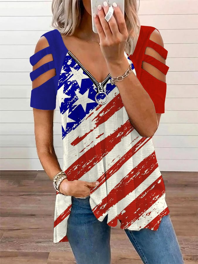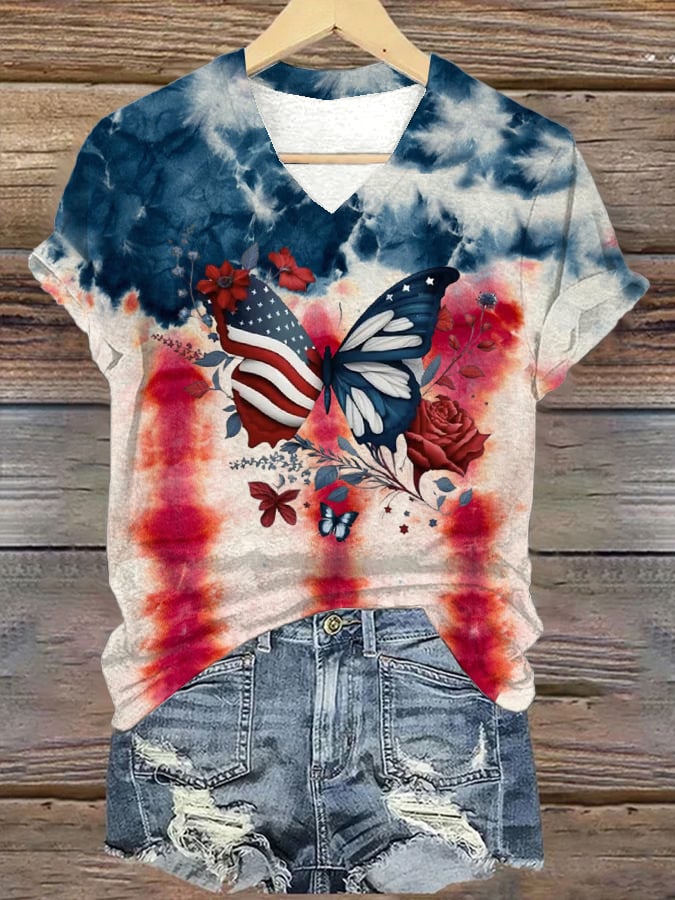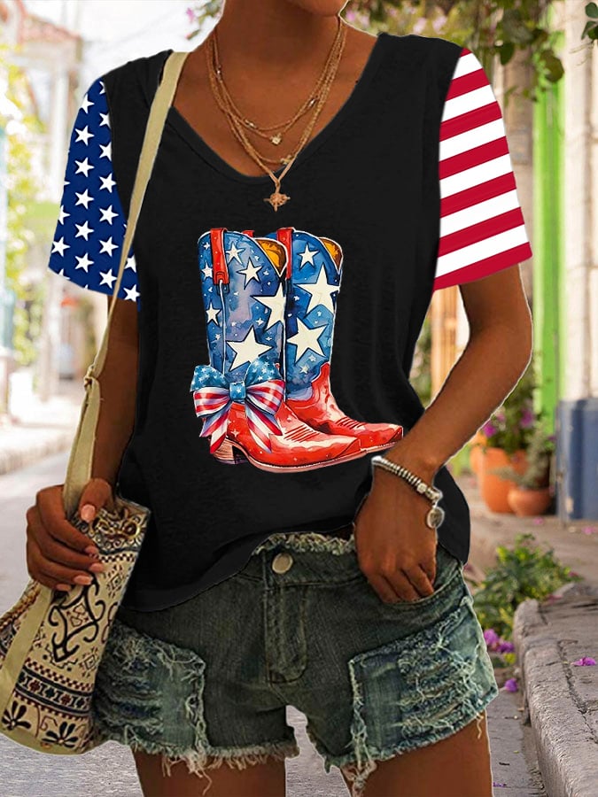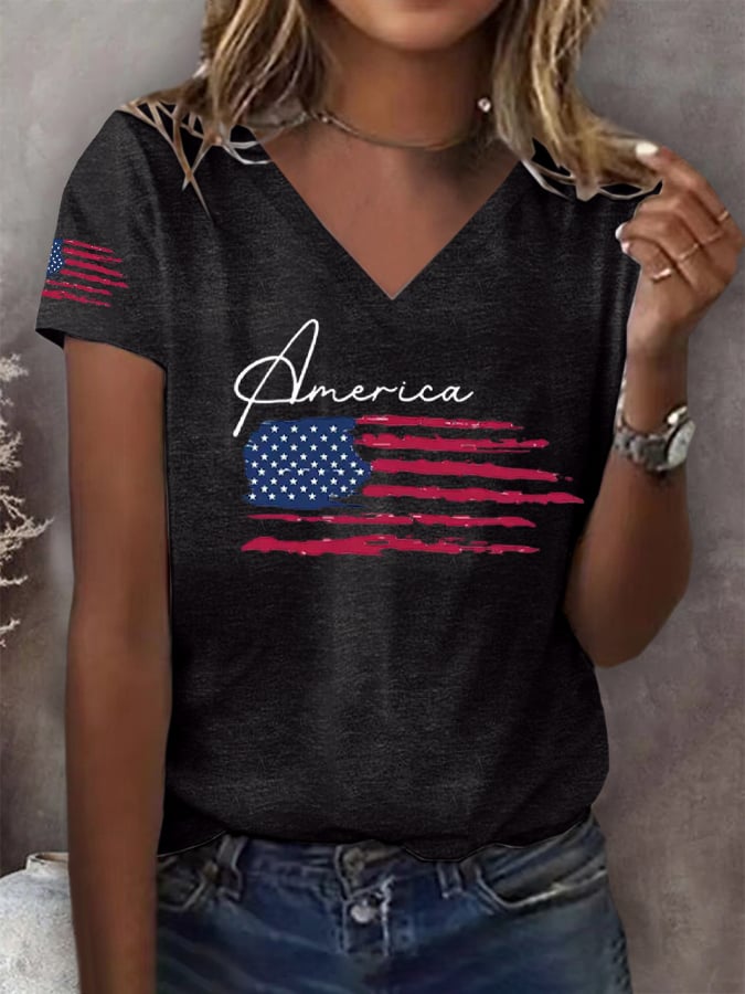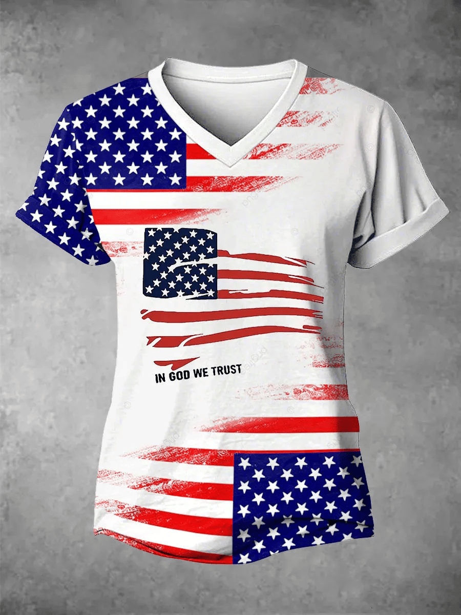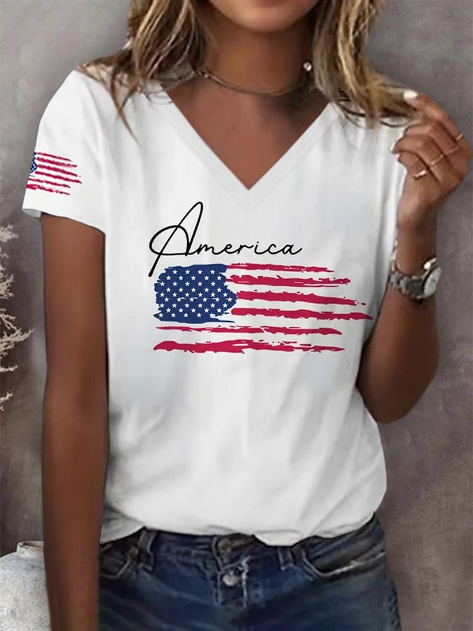 Women'S V-Neck Independence Day Flag Graphic T-Shirt