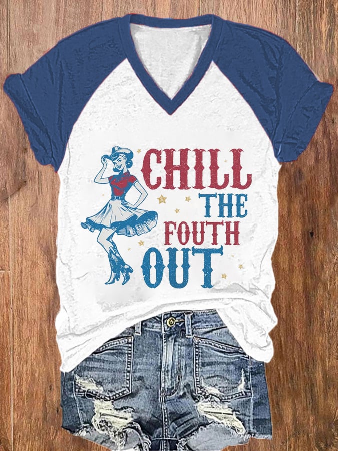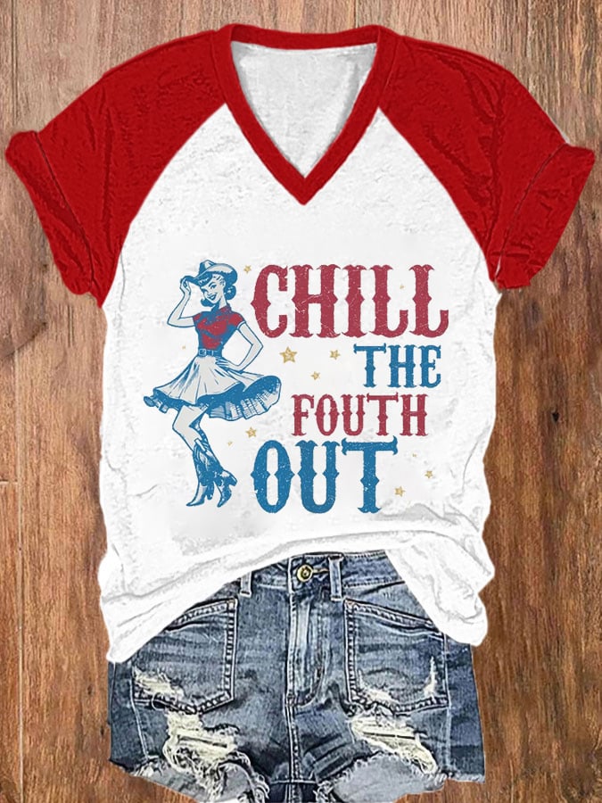 Women's Independence Day Chill The Fourth Out Print V-Neck T-Shirt