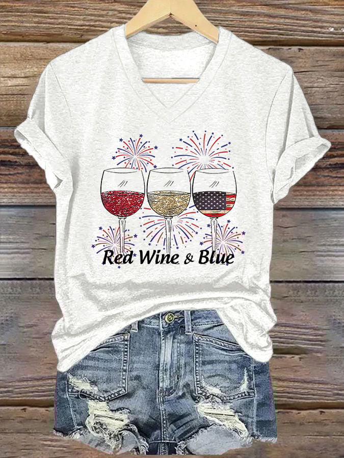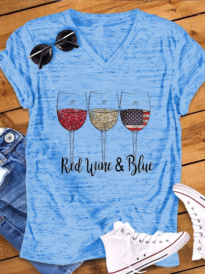Women's Red Wine Blue Wine Glass Flag Print Snowflake Dot V-Neck Short Sleeve T-Shirt