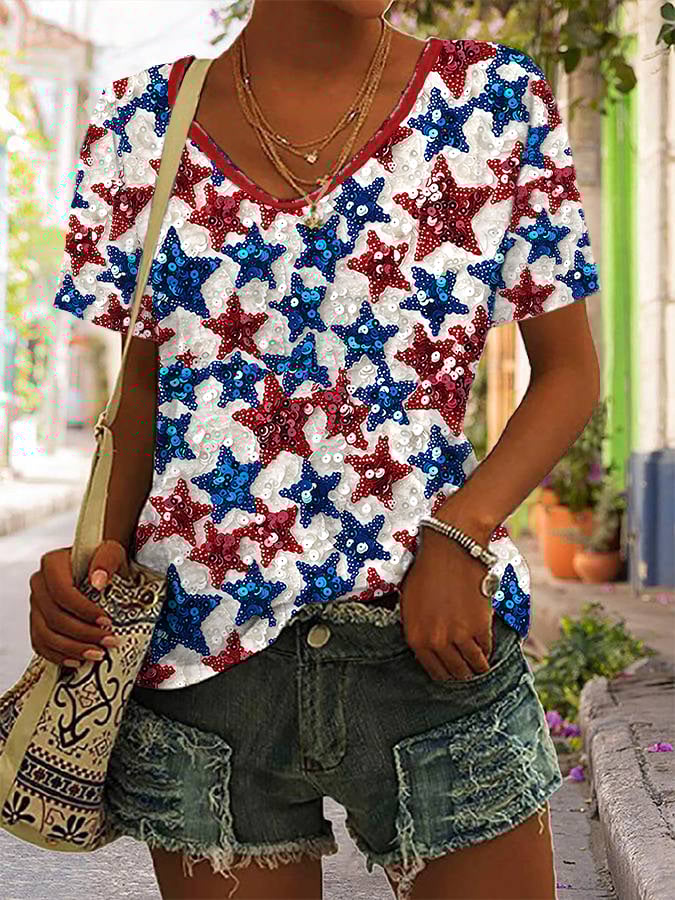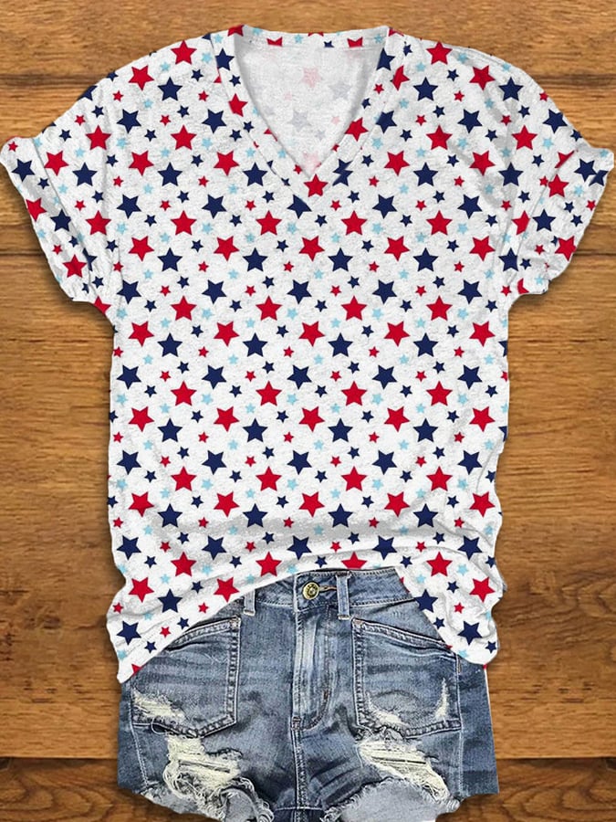 Women's Independence Day Red White Blue Stars Print V-Neck T-Shirt