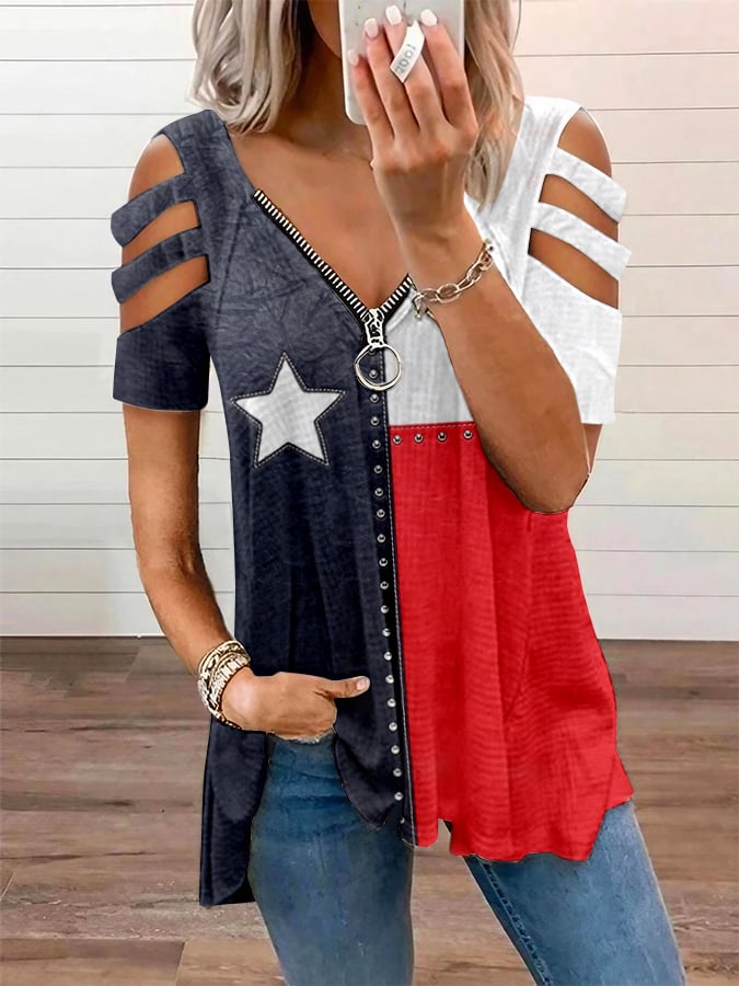 🔥Last Day 49% Off🔥Women's Vintage American Flag Print Zipper Off Shoulder Casual T-Shirt
