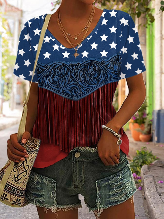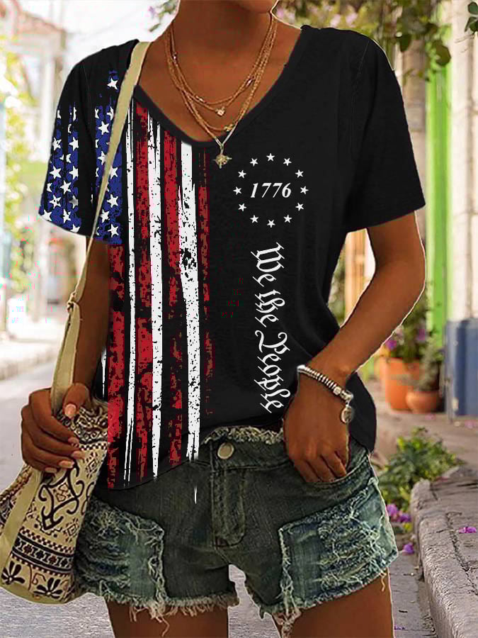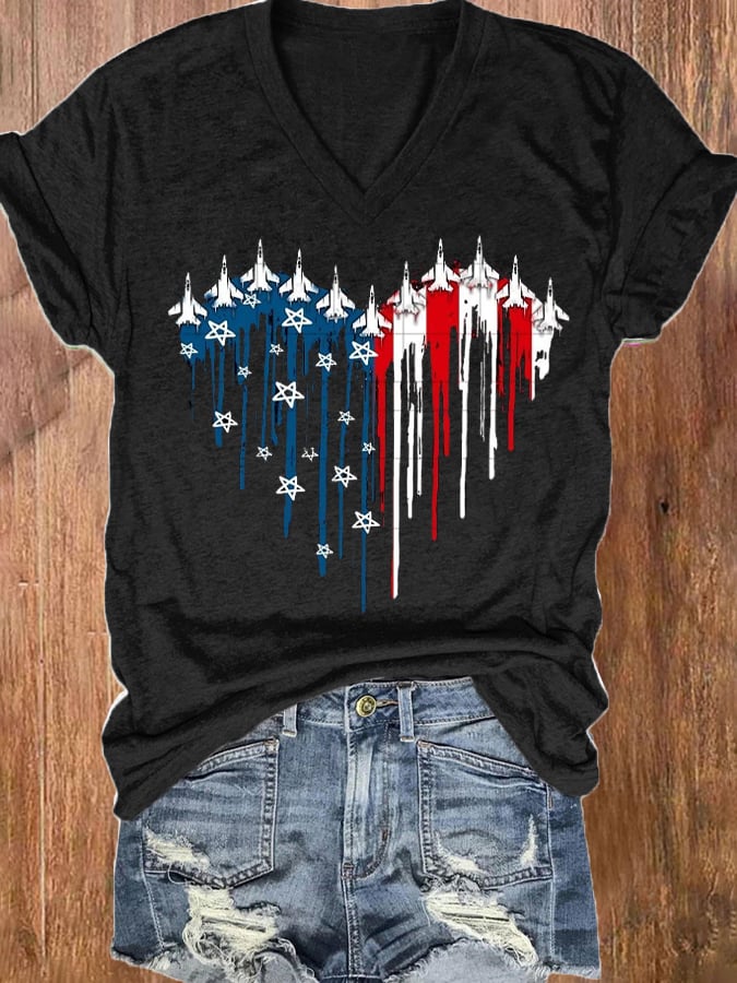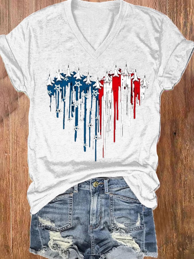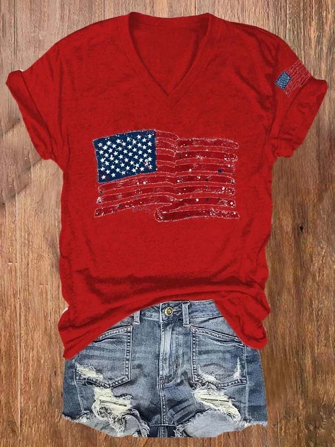 Women's Independence Day American Flag Casual V-Neck Tee