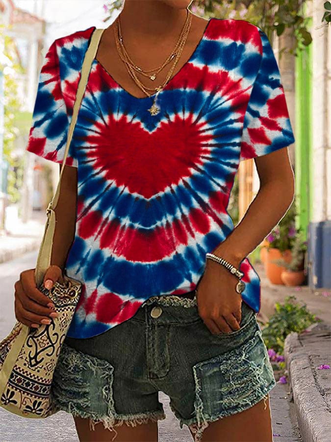 Women's Independence Day Red And Blue Tie-dye Love Print V-neck T-shirt