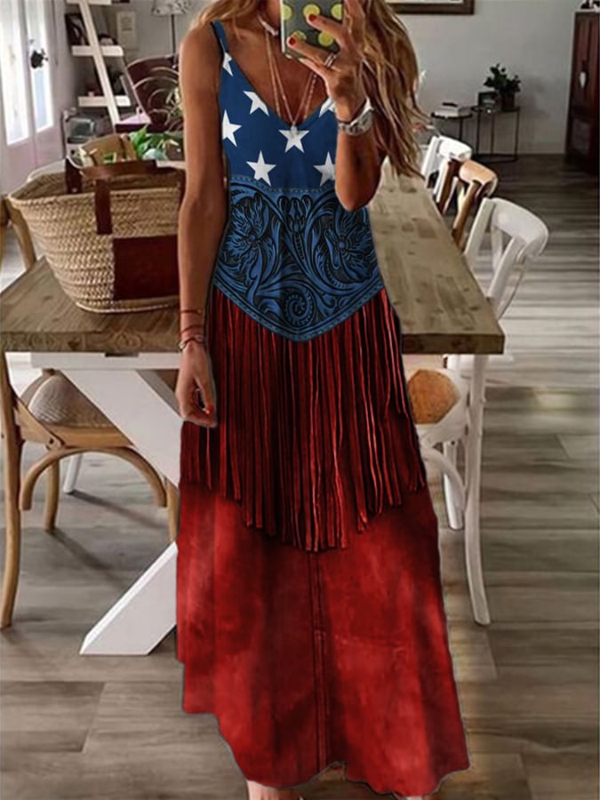 🔥Last Day 49% Off🔥Women's American Flag Pattern Floral Tassel Art Print Sleeveless Maxi Dress