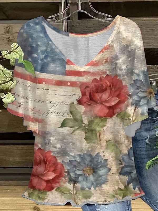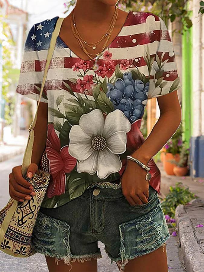 Women's Independence Day Flag Floral Print V-Neck T-Shirt