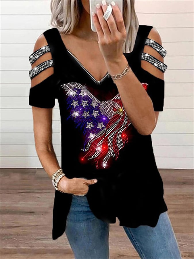 Women's Independence Day Sparkle Print V-Neck Casual T-Shirt