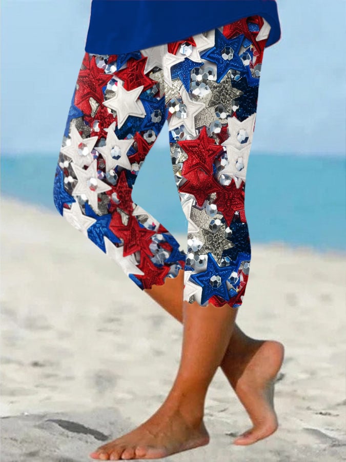 Women's Red Blue Stars Print Cropped Leggings