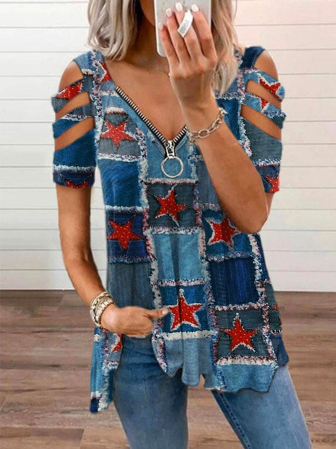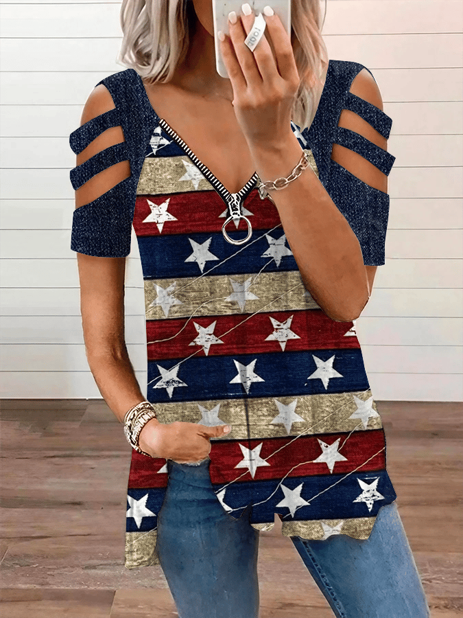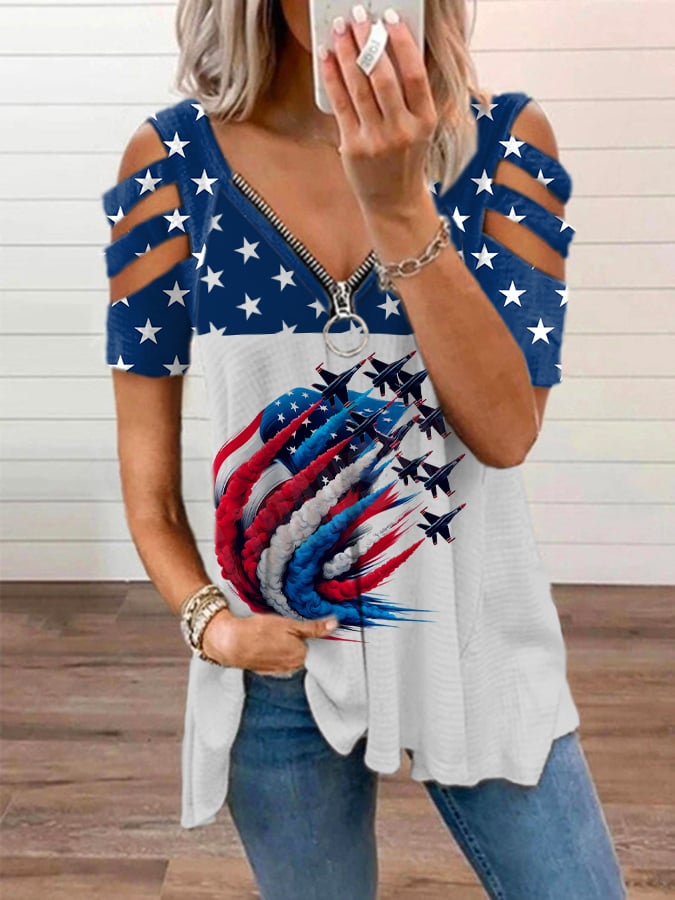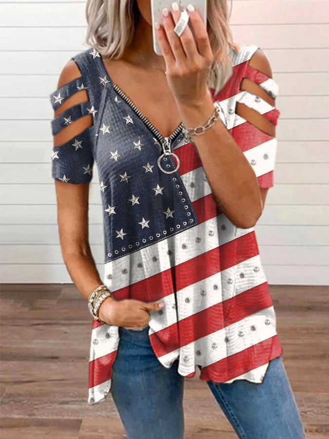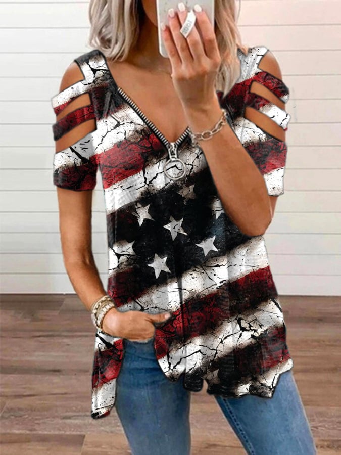 🔥Last Day 49% Off🔥Women's Vintage American Flag Print Zipper Off Shoulder Casual T-Shirt