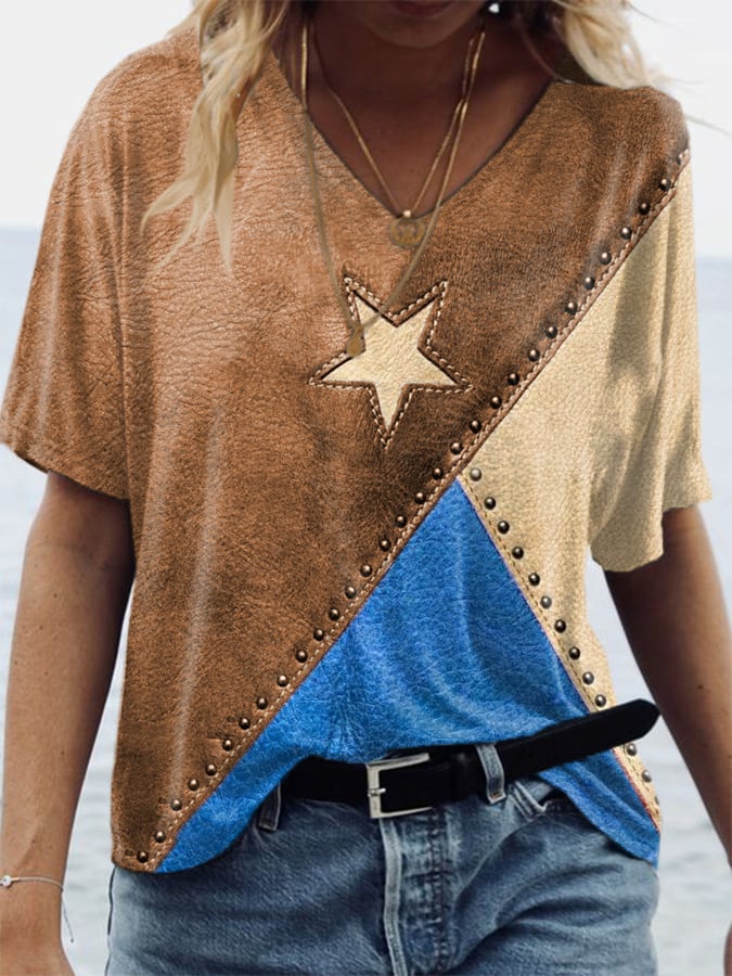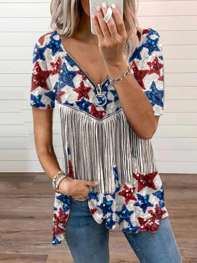 🔥Last Day 49% Off🔥V-Neck Retro Independence Day Flag Color Block Rivets Zipper Print T-Shirt