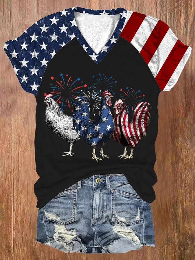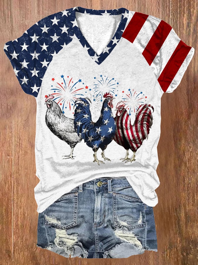 🔥Last Day 49% Off🔥Women's Patriotic USA Chicken Print V-Neck Casual T-Shirt