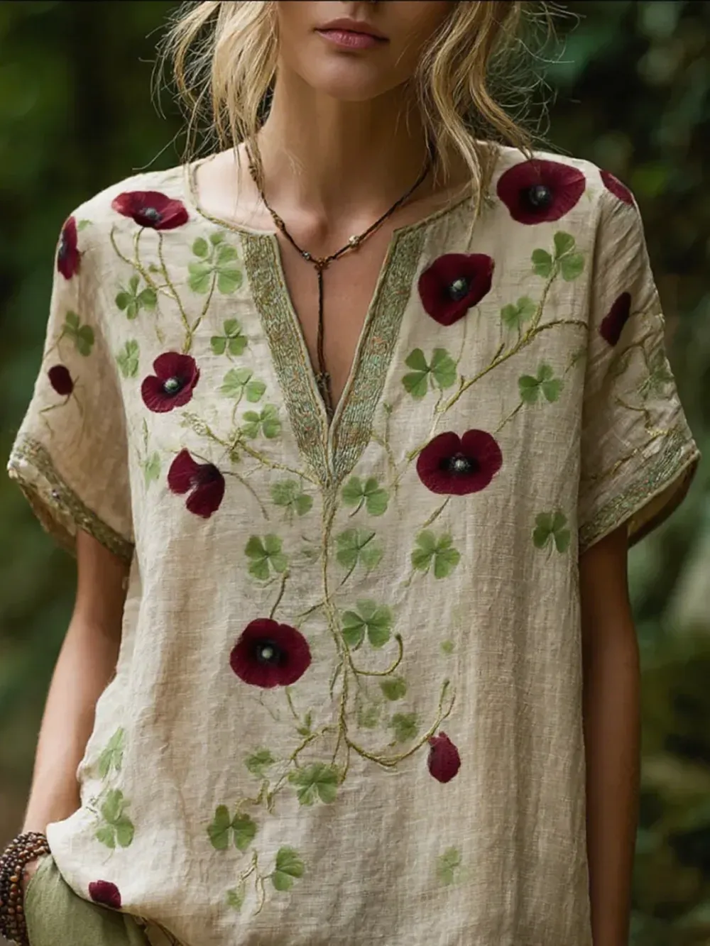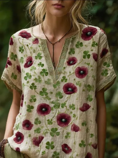 Bohemian Style Flower Vintage V-neck Short-sleeved Shirt