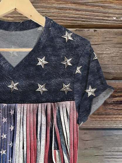 🔥Last Day 49% Off🔥V-Neck Retro Independence Day Flag Color Block Rivets Tassel Print T-Shirt