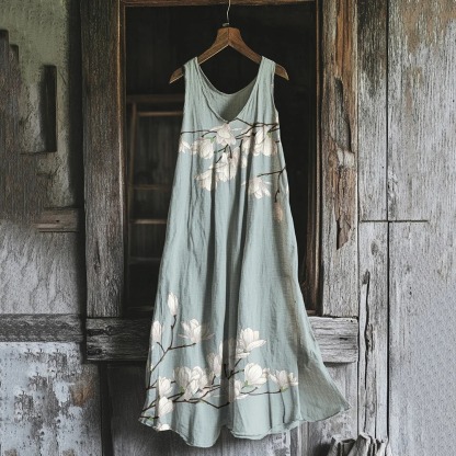 Vintage Magnolia Art Cotton Linen Comfy Tank Dress