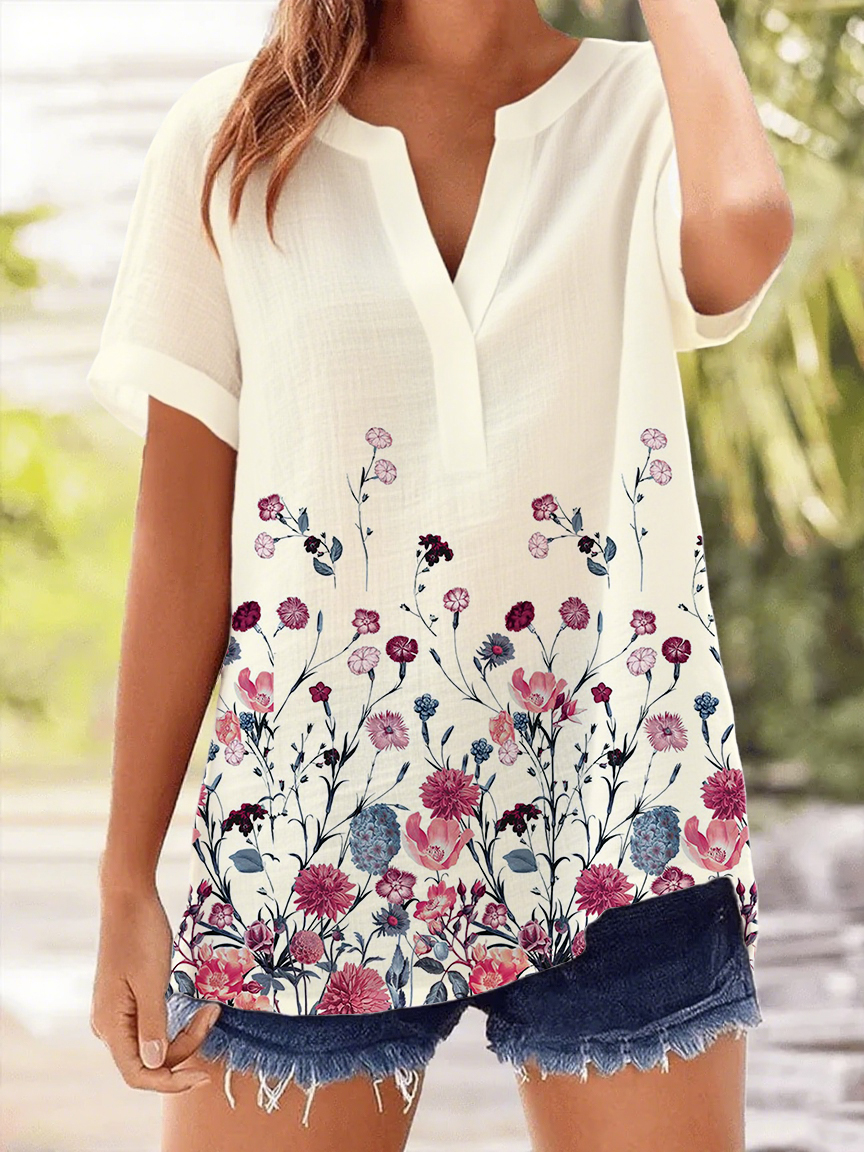 Women's Vintage Floral Casual V-Neck Cotton and Linen Shirt