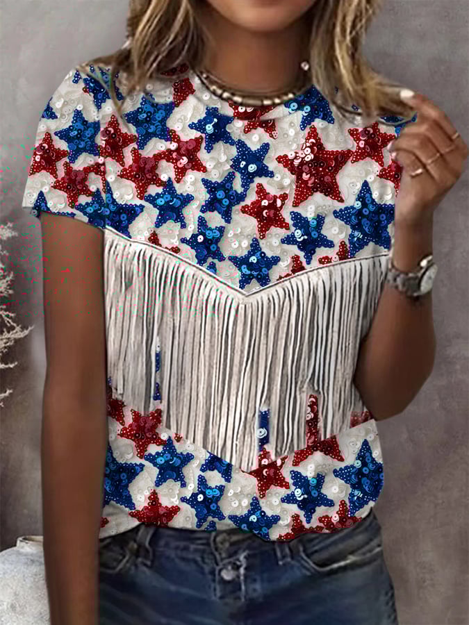 Women's American Flag Stars Glitter Sequin Tassel Print T-Shirt