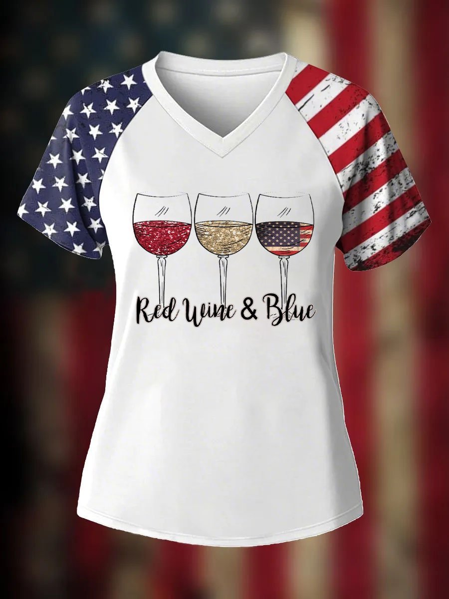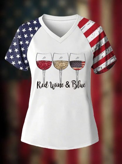 Women's American Independence Day Red White Blue Wine Glasses Printed Short-Sleeved T-Shirt