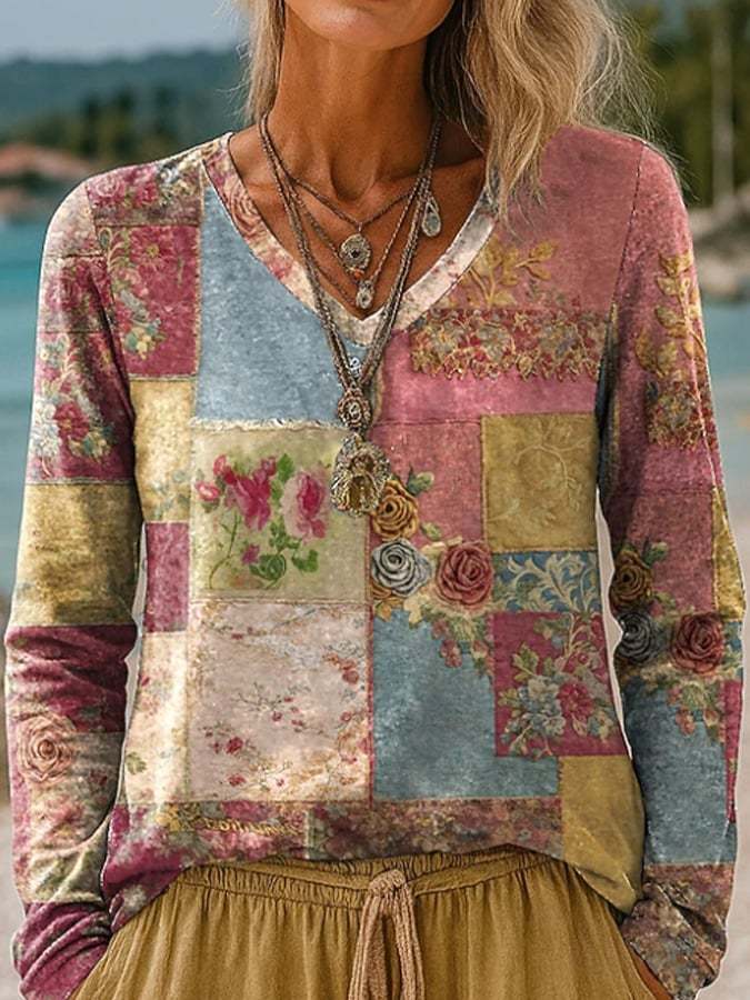 Women's Casual Pink Floral Print V-Neck Long Sleeve T-Shirt