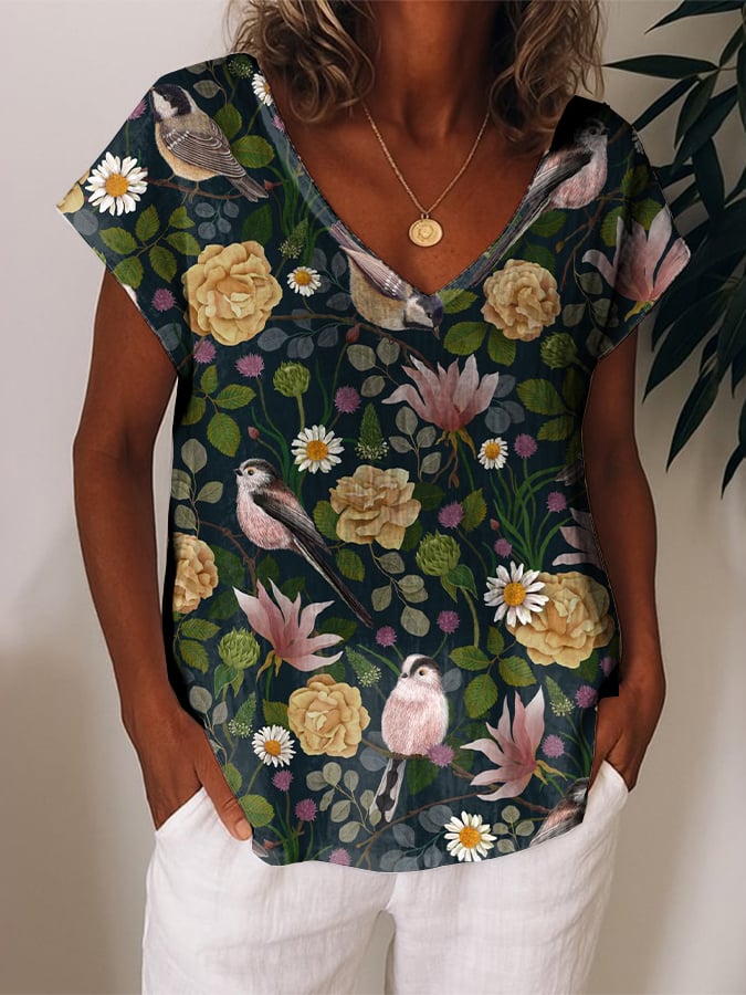 Women's Casual Retro Forest Animal Print Cotton and Linen Top