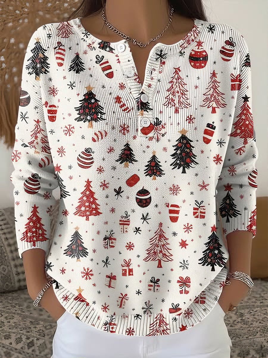 Women's Christmas Print Knit Button-Up Top