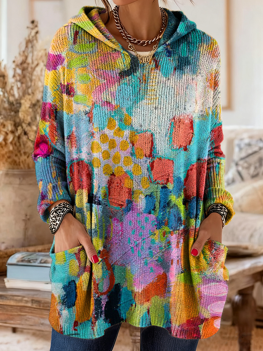 Women's Colorful Art Print Casual Long-Sleeved Hooded Cotton Knit Sweater