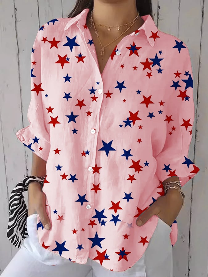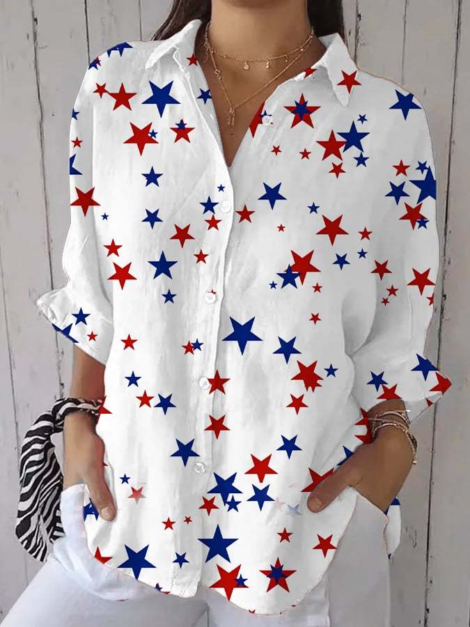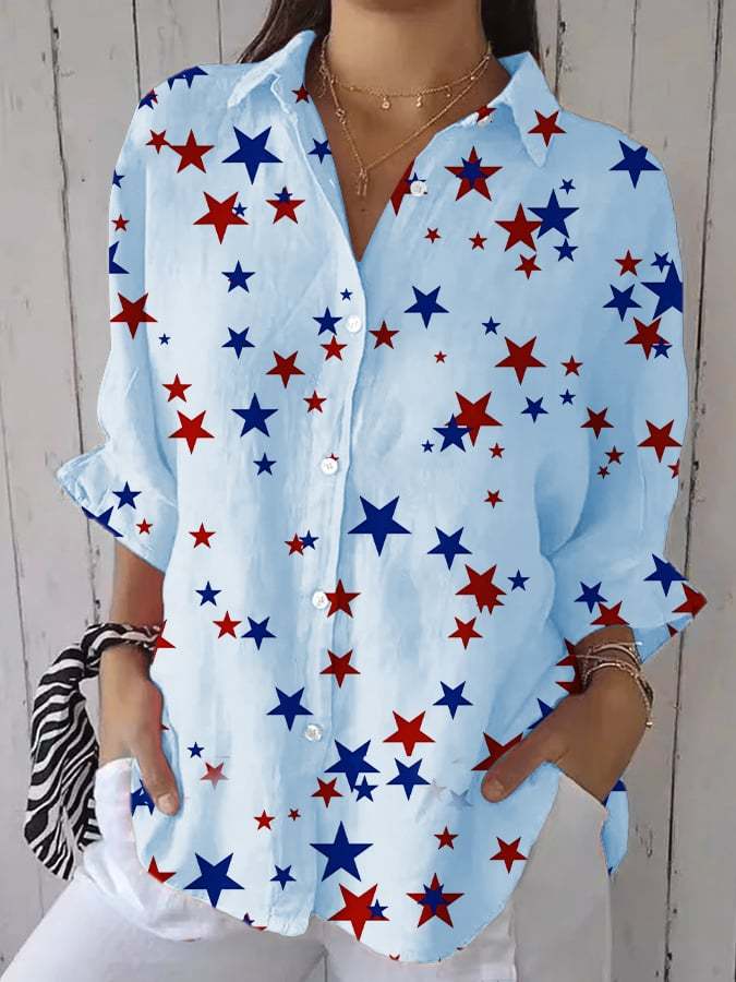 Women's Fashion Casual Independence Day Star Printed Cotton and Linen Shirt