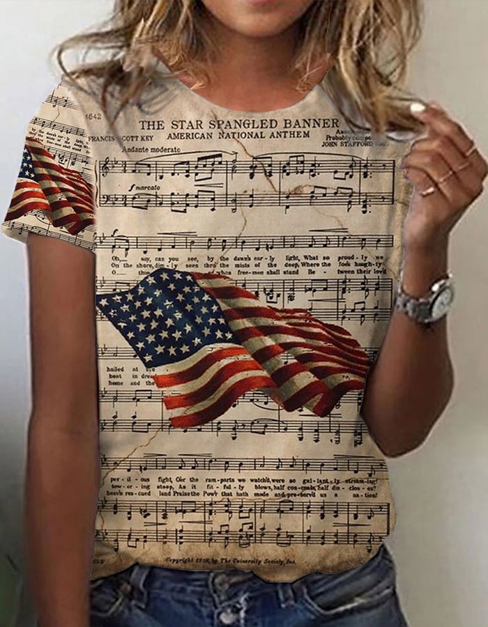 Women's Independence Day American Flag Printed Crew Neck T-Shirt