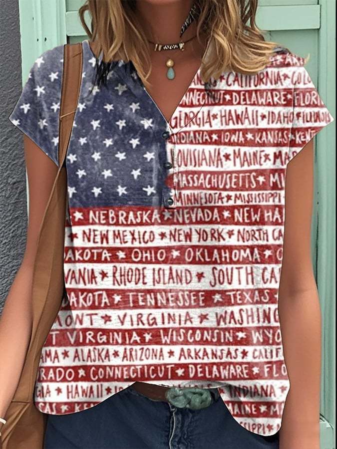 Women's Independence Day cotton and linen short-sleeved shirt