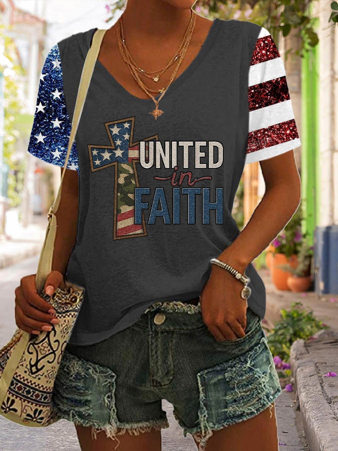 Women's Independence Day Cross United In Faith Print V Neck T-Shirt