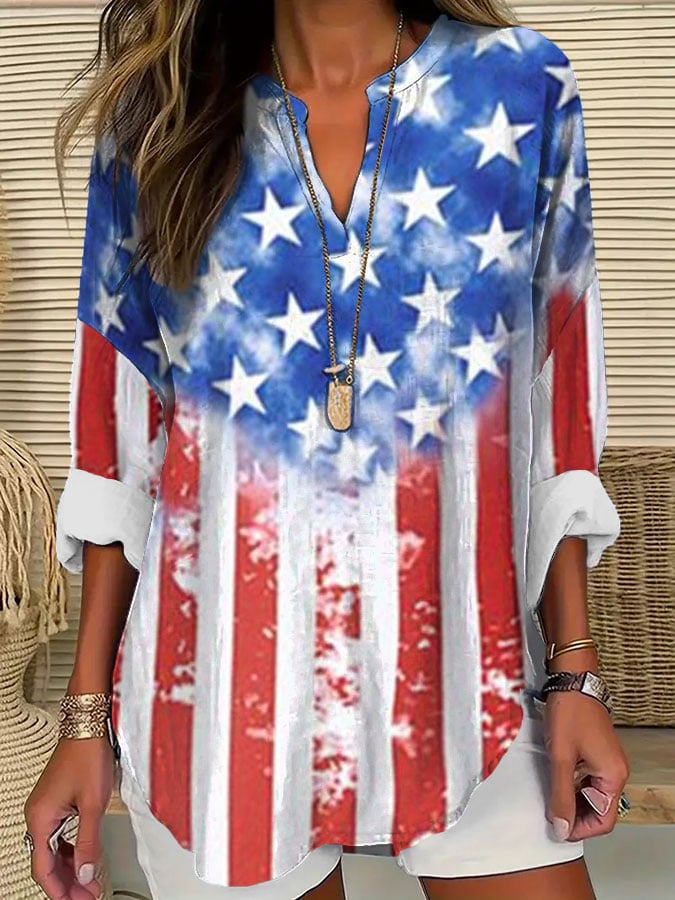 Women's Independence Day Flag Printed Cotton and Linen Shirt