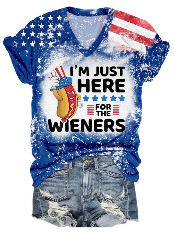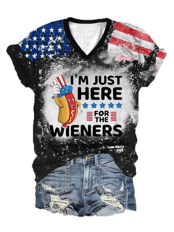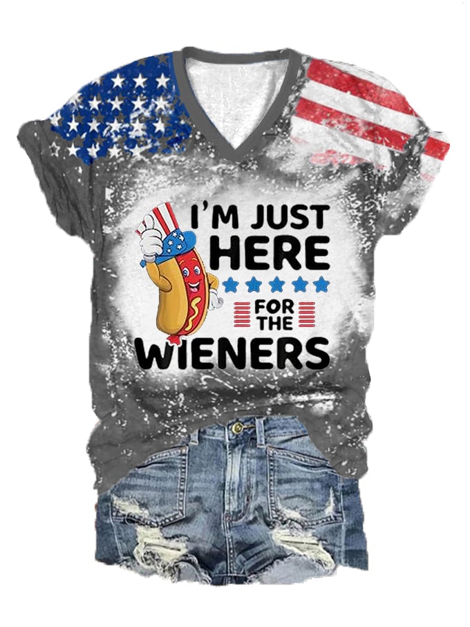 Women's Independence Day I'm Just Here For The Wieners Flag Print V-Neck T-Shirt