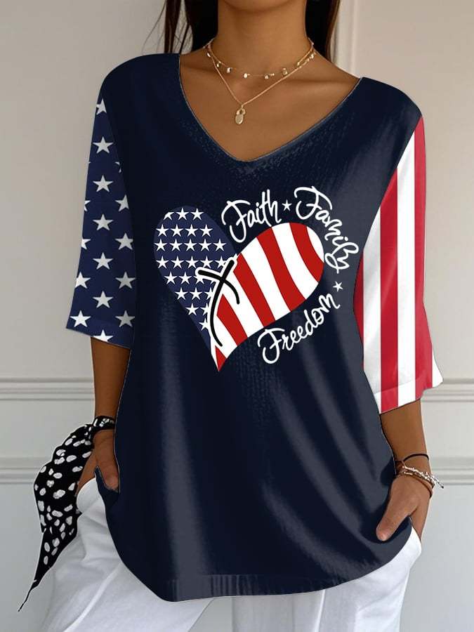 Women's Independence Day Love Faith Family Freedom Print Mid Sleeve T-Shirt